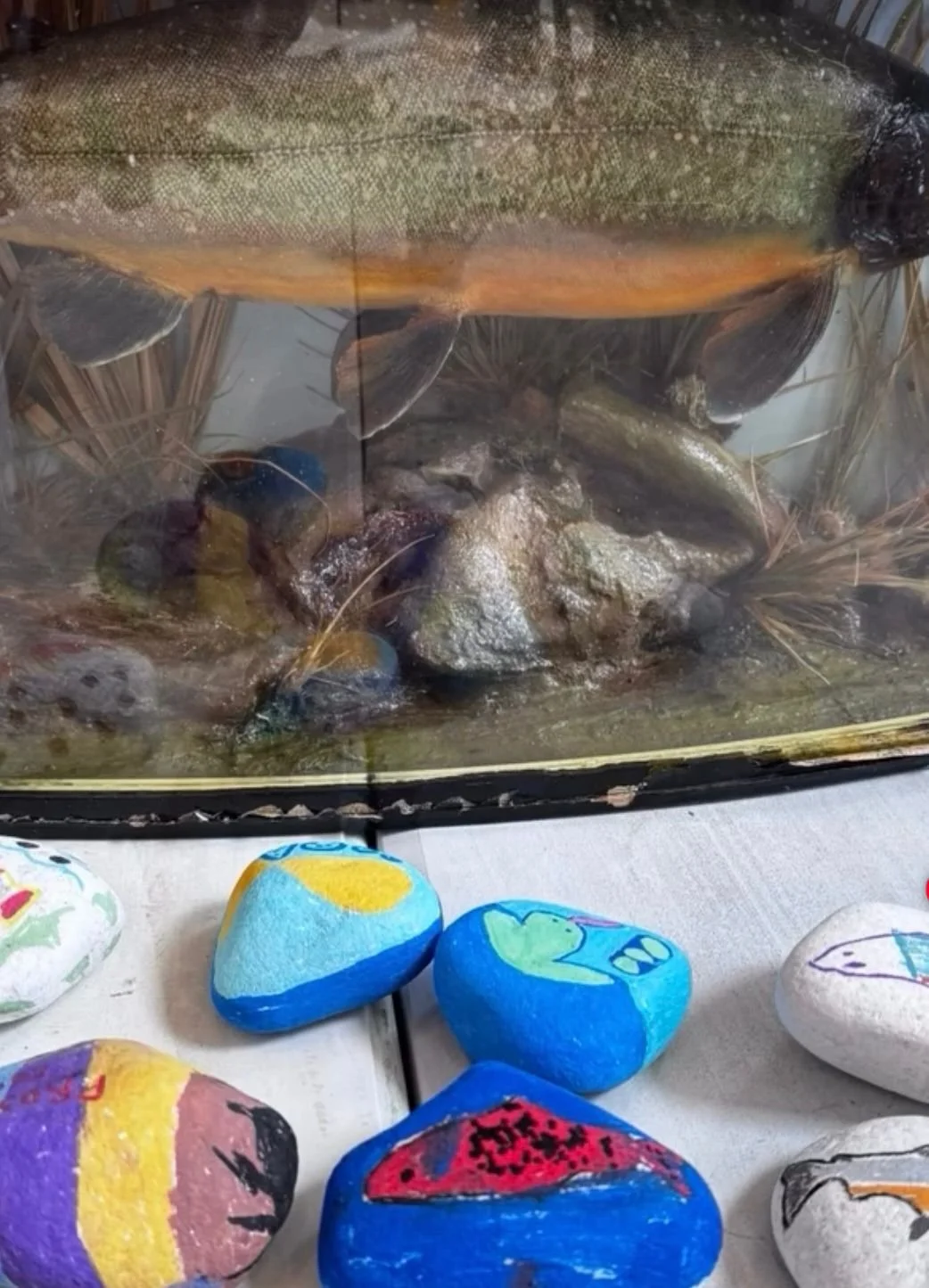 Led by Poppy and Josh, the session invited adults with additional support needs to explore the story of the Torgoch through hands-on art. Using smooth, rounded pebbles collected from local rivers, participants painted their own colourful interpretations of this iconic fish, inspired by its deep red hues and shimmering silver scales.