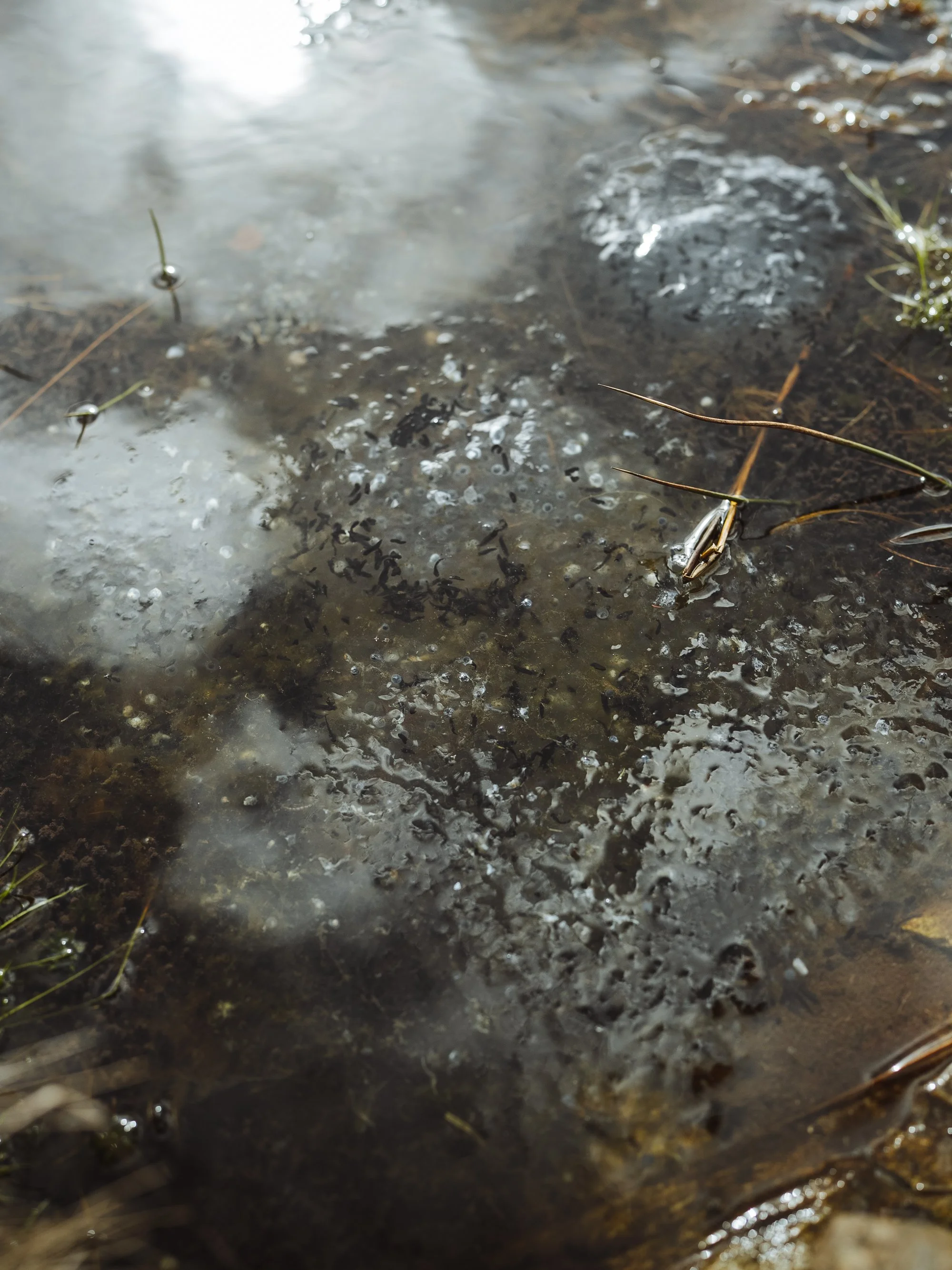 As can be seen in the image above, the installed leaky dams and associated bunds are creating a series of small wetted areas and shallow pools upstream of the structures. These areas temporarily store water during rainfall events and maintain damp or standing water conditions for longer periods. The resulting habitat has already begun to support a range of aquatic life, with the pools providing suitable breeding and refuge habitat for aquatic insects and amphibians, including the presence of frog spawn.