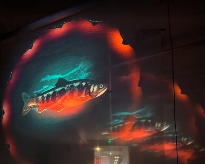 “This commission from North Wales Rivers Trust is tapping into an archetypal technology. It is however a cultural mechanism that has become more scarce as our compartmentalised ‘Western’ society has increasingly sought to separate itself from Nature. This is a futile endeavour because we are Nature; if it withers, so do we... For this Ice Age refugee, co-evolved over millennia with the mountain lakes it inhabits, is ambassador for an entire ecosystem... The distinctively coloured amber-to-red belly of the male fish is a warning light; an alarm signal to us from the rapidly suffocating life support system on which our own existence is entirely dependent.”